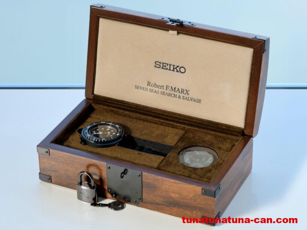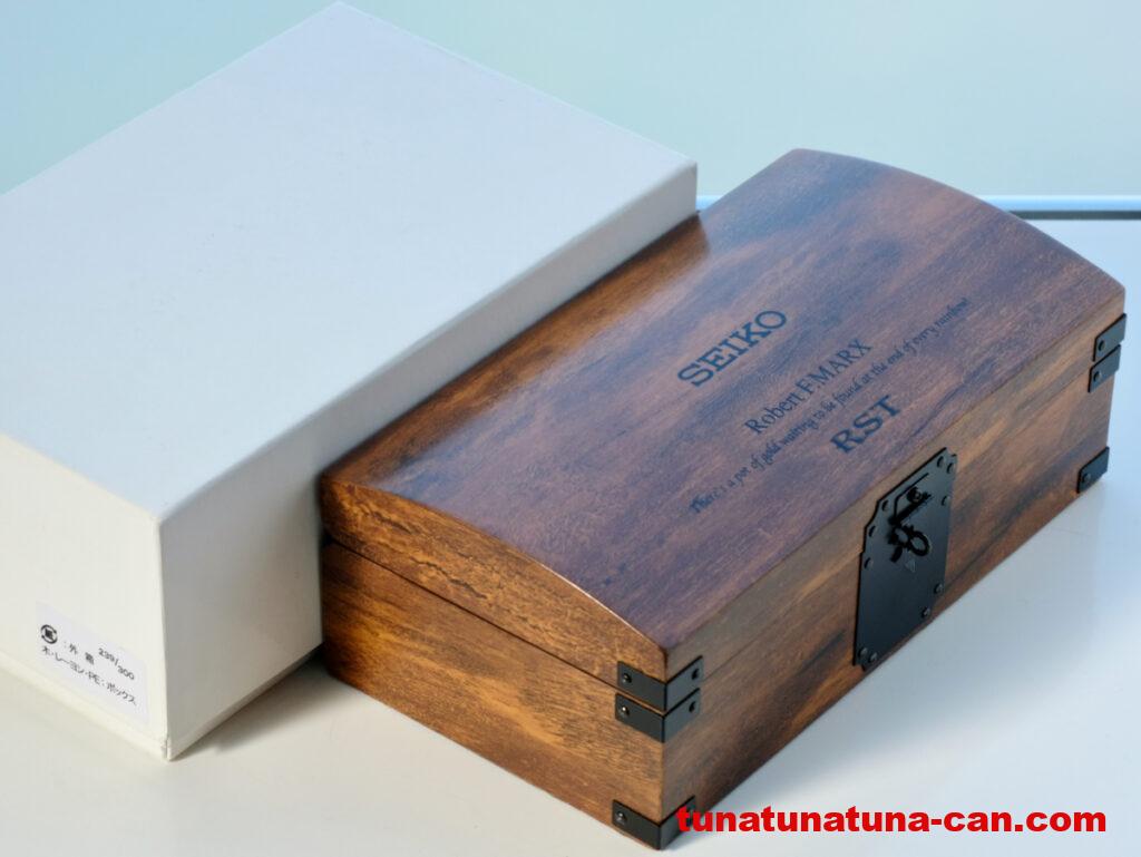 付属品は、宝箱を模した木製の鍵付き専用箱に